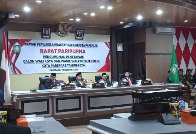 Parepare, kanal-berita.com – DPRD Kota Parepare menggelar paripurna tentang pengumuman penetapan Wali Kota dan Wakil Wali Kota Parepare terpilih periode tahun 2025-2030 di ruang sidang DPRD, Jumat (7/2/2025).